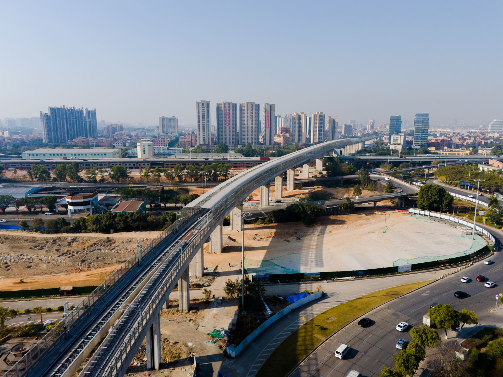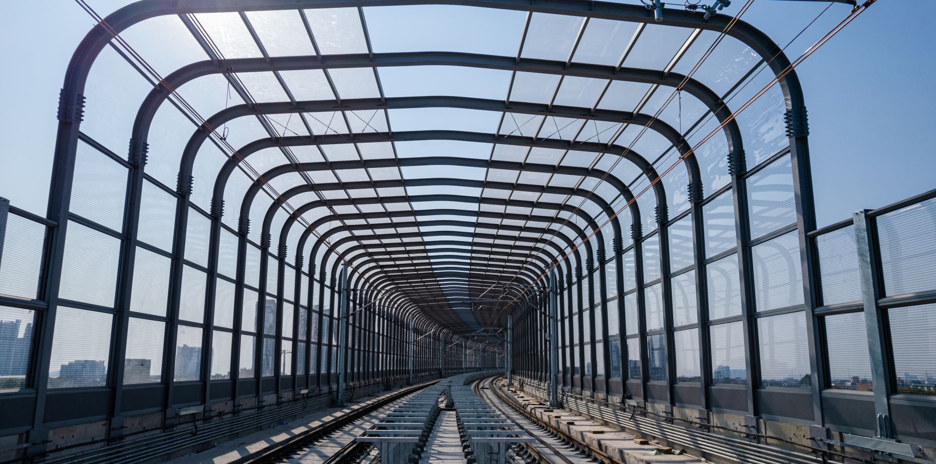 声屏障屏体分为金属吸声屏体和通透隔声屏体;通透隔声屏体选用加筋亚克力板,抗冲击、隔音、透光性能出色;弧形部位亚克力采用热弯工艺,避免开裂风险。全封闭钢构采用热镀锌表面防腐处理。整体结构设置防坠落装置,保障使用安全。