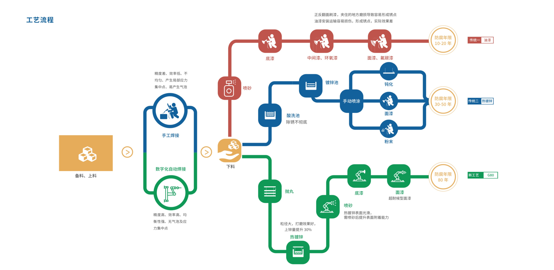 由锌、锌铝合金、铝镁合金、锌镍合金、等稀有元素制成的液体混合物。是一种铁基材与熔融锌反应生成一合金化的锌层的工艺过程,其优点在于防腐年限长久,适应环境广泛,一直是一种很好的防腐处理工艺。工件的防腐性能由锌层的腐蚀速率决定,锌层厚度和暴露环境(水汽类型/污染物浓度等)是主要的影响因素。锌层越厚,使用寿命越长,中驰采用先抛丸再镀锌的工艺,极大的提升锌层与基材的结合力,上锌量至少提升30%,锌层厚度达到120~140μm,按照热镀锌层在C3环境中每年厚度损失0.7~2.1um计算,抗腐蚀年限至少达到50年。